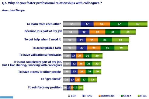 KennisDe belangrijkste reden om een zakelijke relatie aan te gaan met collega’s is omdat je iets kunt leren van elkaar. Deze reden scoort hoger dan het argument dat het nu eenmaal bij het werk hoort. Vooral Millennials zoeken contact voor kennis, hulp bij het werk en feedback. Dit verklaart waarschijnlijk ook waarom hun netwerk erg verspreid ligt over de verschillende generaties. Mensen leggen op kantoor niet zozeer contact voor de gezelligheid. Het gaat ze vooral om er iets van te leren of hulp te krijgen. Dat is goed nieuws voor alle organisaties die kennisoverdracht hoog in het vaandel hebben staan.