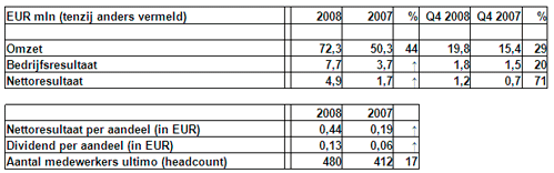 - Bedrijfsresultaat ruimschoots verdubbeld; operationele marge sterk verbeterd van 7,3% in 2007 naar 10,7% in 2008