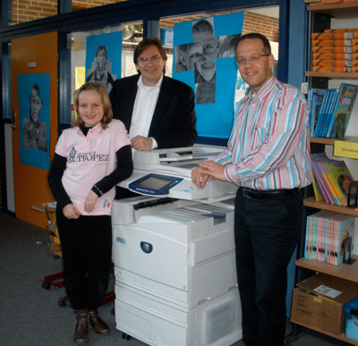 Het officiële overdrachtsmoment van de machine aan de school met van links naar rechts Christine, Gerard Kruijt (Business Manager Xerox Office Group) en Paul Bouw (Directeur basisschool Het Baken)