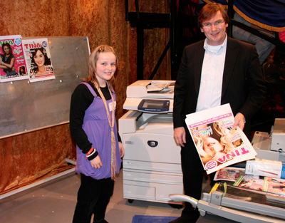 Breukelen, 3 april 2009 – Met de schenking van een WorkCentre 7235 multifunctionele kleurenprinter heeft Xerox de eerste stap gezet om gebruikte machines een tweede leven te gunnen en deze aan te bieden aan basisscholen. Tijdens het kinderprogramma de BZT show van afgelopen zaterdag ontving Christine, leerling van basisschool Het Baken in Veenendaal, uit handen van printerspecialist Gerard Kruijt een multifunctionele A3-kleurenprinter. Christine lijdt aan dyslexie en heeft moeite met het lezen van teksten op klein formaat, zoals tijdschriften en strips. Om toch haar lijfblad Tina te kunnen lezen had ze haar wens voor een machine die haar strips kan vergroten naar A3-formaat bij de BZT show ingediend.
