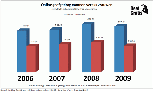 Grave, 7 april 2008. Vrouwen blijken onder invloed van de kredietcrisis gemiddeld minder te geven aan goede doelen in Nederland. Mannen blijken daarnaast online via internet meer geld te geven aan goede doelen dan vrouwen. Uit onderzoek verricht door Stichting GeefGratis blijkt dat mannen in 2009 gemiddeld afgerond € 87,- via internet geven en vrouwen € 50,-. Mannen geven dus online 1,74 x meer geld aan goede doelen dan vrouwen. Deze gegevens zijn gebaseerd op meer dan 15.000 transacties via de online donatiemodule van Stichting GeefGratis tussen 2006 en het 1e kwartaal 2009.