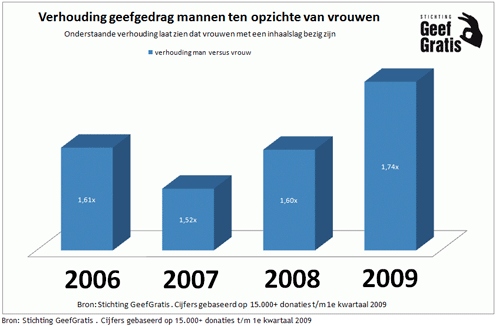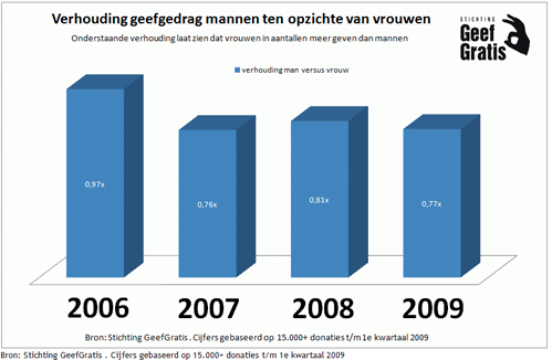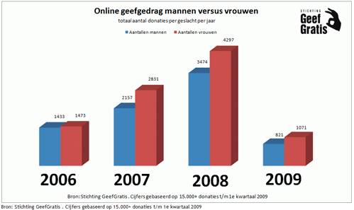 Vrouwen geven online vaker dan mannenVerder blijkt uit de geef indexcijfers van GeefGratis dat vrouwen in absolute aantallen nog steeds vaker doneren dan mannen maar dit uit zich niet in de totaalbedragen per jaar omdat vrouwen dus gemiddeld minder geven dan mannen. De geef indexcijfers zijn dus op twee manieren te interpreteren. Kijkt men naar de gemiddelde donatiebedragen dan zijn mannen vrijgeviger dan vrouwen. Kijkt men echter naar de absolute aantallen dan blijken vrouwen ineens vrijgeviger te zijn dan mannen. Ongeacht de kredietcrisis kunnen we spreken van een trend met een opvallend sterk dalend gemiddeld donatiebedrag bij vrouwen.