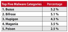 Top vijf virusfamiliesOp basis van overeenkomsten in programma code, verdeelt G Data malware in families. Onderstaande afbeelding toont de meest voorkomende malwarefamilies. Zo zoeken bijvoorbeeld trojans van de Buzusfamilie in geïnfecteerde systemen naar persoonlijke gegevens zoals creditcardinformatie, wachtwoorden voor online bankieren en e-mailgegevens.