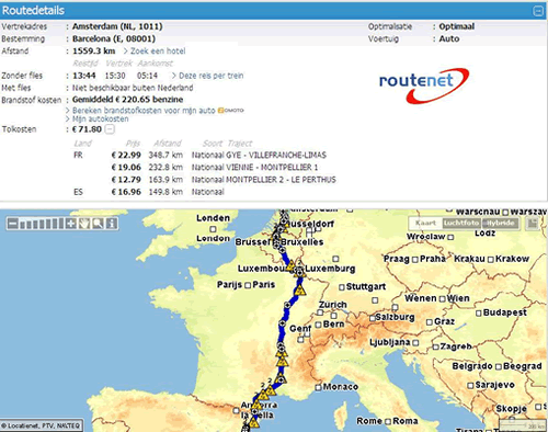 www.routenet.nl de tolkosten op een geplande route in heel Europa. Met deze nieuwe functie completeert Locatienet de routedetails naar het buitenland. Naast het berekenen van de tolkosten wordt ook de afstand, reisduur en de brandstofkosten weergegeven. Met behulp van deze nieuwe tool kunnen gebruikers van te voren precies berekenen wat de kosten zijn van een reis met de auto door Europa.