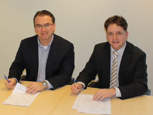 De contracttekening tussen Document Dialog en ReadSoft met links Gert-Jan de Vries (ReadSoft) en rechts Dennis Koorn (Document Dialog)