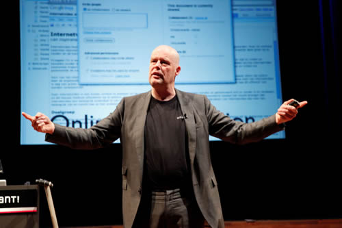 Vincent Everts tijdens zijn presentatie: Communicatie 2.0, consumenten gebruiken het veel, bedrijven moeten volgen.