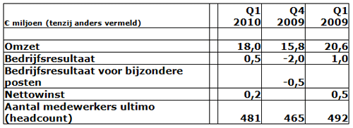 Het bedrijfsresultaat in het eerste kwartaal van 2010 bedroeg € 0,5 miljoen positief (Q4 2009: € 0,5 miljoen negatief; Q1 2009: € 1,0 miljoen positief). De negatieve trend in de resultaatontwikkeling gedurende 2009 is in het eerste kwartaal van 2010 gekeerd. Dit is het gevolg van een hogere bezettingsgraad en een beter resultaat op projecten.