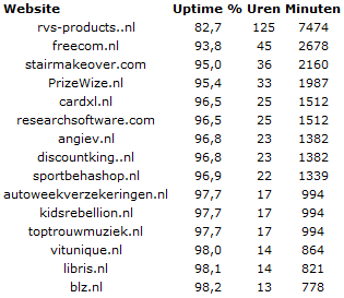 Methodologie: Uptrends heeft de voorpagina van de website gecontroleerd door middel van 42 wereldwijde controlestations websites elke 5 minuten een meting te doen. Indien een website niet bereikbaar was, is dit steeds door een ander controlestation nogmaals gecontroleerd en zo mogelijk bevestigd. Periodes waarin een website bereikbaar is, worden door Uptrends geregistreerd als uptime. De periodes waarin de bevestigde fouten voorkwamen, worden als downtime geregistreerd. Het betreft verder alleen de bereikbaarheid van de voorpagina en er is geen rekening gehouden met onderhoud.