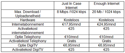 Just in Case Internet (8 Mbps) en Enough Internet (20 Mbps) kosten elk resp. €17,95 en €24,95 per maand. De nieuwe abonnementen worden standaard geleverd met een draadloze Zyxel 2612HW multimedia-modem (die 4 pc’s en internettelefonie ondersteunt), inclusief splitter, ter waarde van €139. Klanten die voor de optie DigiTV kiezen krijgen bovendien gratis een tv-startpakket met settopbox, antenne en smartcard ter waarde van €114.