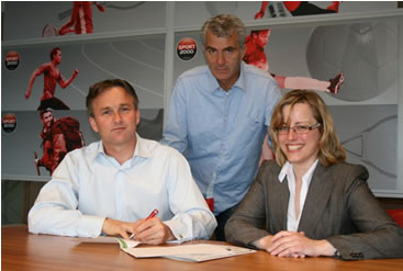Foto: v.l.n.r.: Jan van der Wouw ( directeur Sport 2000), Dirk Vermeij (manager franchise Sport 2000), Lisa De Jong ( sales manager XRC services) |
