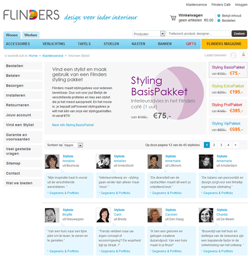 Flinders werkt exclusief samen met interieurstylisten die zijn aangesloten bij CRISP. Dat geeft de consument de zekerheid met professionele stylisten te werken. De consument kan via de website van Flinders eenvoudig een CRISP stylist vinden. De aanwezige filters maken het mogelijk te zoeken op regio, naam en binnenkort op discipline. Van de 45 aangesloten stylisten is een uitgebreid CV en de NAW gegevens te vinden. De consument bepaalt zelf hoeveel stylingadvies hij of zij wil aan de hand van een viertal stylingpakketten variërend van €75 tot €695.