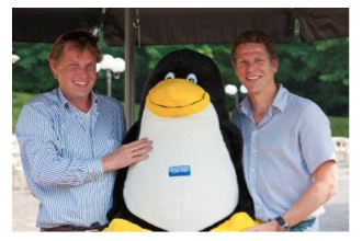 v.l.n.r. dhr. H.W.W. Kunst (OpenSesame ICT) overhandigd dhr. P. Adema (hoofd informatiemanagement Bouwfonds) ter ere van de projectdecharge de OpenIMS mascotte.