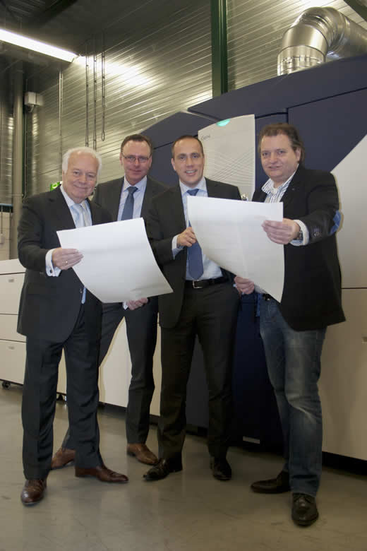 Bijschrift bij foto: vlnr. Hans Corsmit (Jetmail), Redmer Toxopeus (Xerox), Marcel Martens (Xerox) en Tim Corsmit (Jetmail) bij de nieuwe iGen4 EXP.