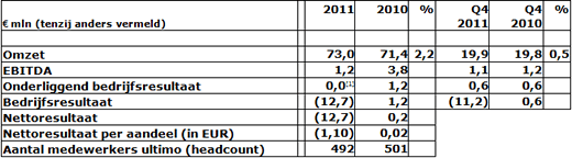 - Geleidelijke verbetering van onderliggend bedrijfsresultaat vanaf medio 2011 zet door in vierde kwartaal (€ 0,6 miljoen) en in eerste maanden van 2012