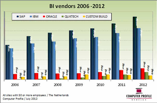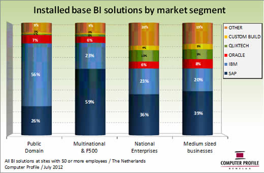 Ieder marktsegment heeft zo zijn eigen voorkeur voor een BI-oplossing. In het Nederlands publieke domein is IBM de meest voorkomende BI-oplossing. Meer dan de helft van de gebruikte BI-oplossingen bij overheids-, onderwijs- en zorginstellingen betreft een IBM-installatie. SAP is in het publieke domein goed voor ruim een kwart van de installaties. Bij bedrijfsvestigingen die een onderdeel vormen van een multinational of een Fortune 500 organisatie is dat juist andersom. Hier vormt SAP bijna 60 procent van de installaties en is IBM goed voor bijna een kwart van de BI-oplossingen. Segmenten die wel overeenkomen, zijn National Enterprises en Medium Sized Businesses, respectievelijk organisaties met 250 tot 2500 medewerkers en 50 tot 250 medewerkers. Deze segmenten maken relatief vaak gebruik van Qliktech, van maatwerkoplossingen (zowel intern als extern ontwikkeld) en van diverse overige BI-oplossingen.