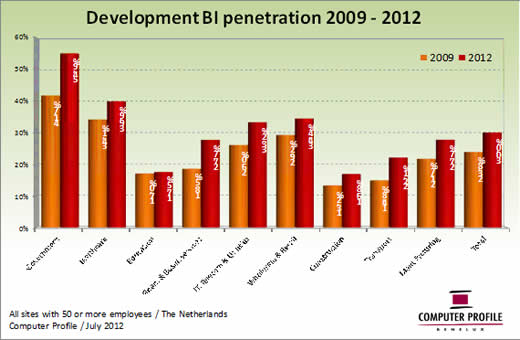 Naast de centrale BI-oplossingen, die in gebruik zijn bij de grotere organisaties, richten de leveranciers zich ook steeds meer op de individuele zakelijke gebruiker, die zelf snel een aantal inzichten wil kunnen creëren in de voor hem relevante bedrijfsinformatie. Wellicht is dat één van de factoren waardoor het gebruik van BI-oplossingen zich blijft uitbreiden over een toenemend aantal bedrijfsvestigingen. Zo ligt de huidige penetratie BI-software bij Nederlandse bedrijfsvestigingen op 30 procent. De afgelopen vier jaar liet telkens een kleine groei zien in dit percentage. Uitzondering op deze regel lijkt de onderwijssector te zijn. In dit segment is het gebruik van BI-oplossingen vanaf 2009 vrijwel gelijk gebleven.