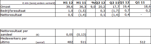 Het netto resultaat over de eerste helft van 2012 kwam uit op euro 0,5 mln (eerste helft 2011: euro 1,4 mln negatief), hetgeen een stijging is van euro 1,9 mln. Op basis van een gemiddeld aantal uitgegeven aandelen van 11.710.928 impliceert dit een netto resultaat per gewoon uitgegeven aandeel van euro 0,05.