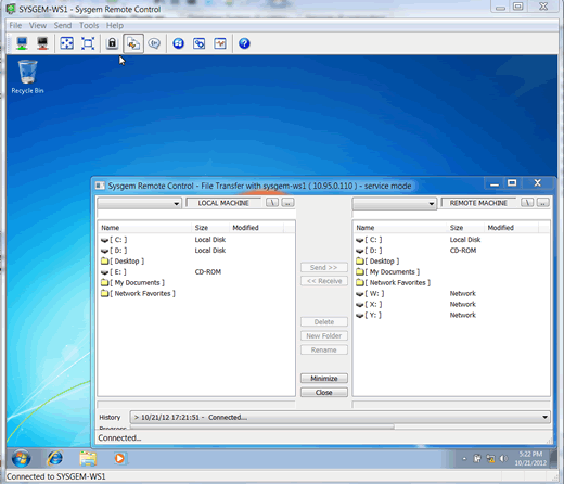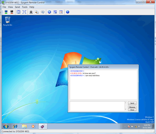 - SysMan Remote Control. De gebruiker kan op eenvoudige en veilige wijze een Windows PC of server op afstand overnemen. De benodigde software wordt optioneel automatisch geïnstalleerd. Er is voorzien in een eenvoudige file transfer en een chat optie. De verbinding met Windows vindt plaats via een beveiligde verbinding. Voor de connectie naar overige platforms (Linux, OSX, Unix, enz..) kan men gebruik maken van een beschikbare VNC cliënt engine.