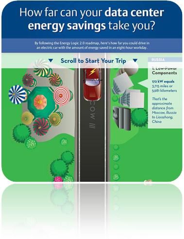 De ‘bewegende’ infographic maakt de energiebesparing inzichtelijk van een datacenter dat acht uur in bedrijf is en dat gebruik maakt van de Energy Logic 2.0-strategie. De infographic doet dit door de bespaarde energie te gebruiken voor een elektrische auto. Hoe ver komt deze elektrische auto? De nieuwe infographic toon hoe veel je bespaart met de Energy Logic 2.0-strategie.