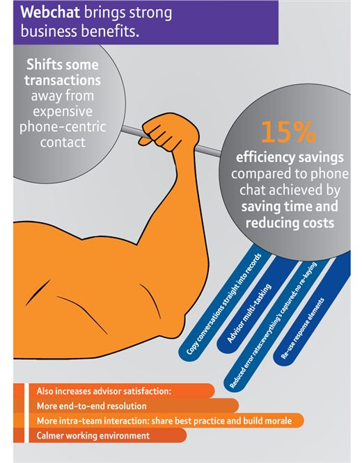 Veel mensen die een vraag hebben, kijken eerst op internet en voor hen is het vaak net zo gemakkelijk om een webchat-sessie te starten als de telefoon te pakken. Verdere voordelen zijn een meer kalme en stille werkomgeving voor contactcentermedewerkers en minder uitdagingen wat betreft regionale accenten en achtergrondgeluiden. Webchat biedt ook een duidelijke historie van gesprekken met klanten.