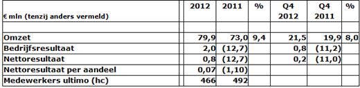 “Ondanks het feit dat in 2012 sprake was van moeilijke marktomstandigheden, die op al onze activiteiten een druk op de marge gaf, zijn we er in geslaagd de reeds in het vierde kwartaal van 2011 ingezette opgaande lijn te continueren. De aangescherpte strategie heeft ertoe geleid dat de omzet in 2012 op autonome wijze is gegroeid met 9,4% tot bijna EUR 80 miljoen. Samen met kostenbesparing heeft dit voorts geresulteerd in een nettowinst van EUR 0,8 miljoen.