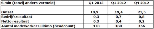 - Netto resultaat daalt licht van € 0,4 miljoen in het eerste kwartaal 2012 naar € 0,3 miljoen in het eerste kwartaal 2013