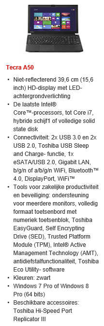 “Met onze Toshiba Tecra-reeks hebben we een reputatie hoog te houden, zeker onder middelgrote tot grote ondernemingen”, aldus Ronald Ravel, Country Manager van Toshiba Information Systems Benelux. “Met de nieuwe Tecra A50 blijven we inzetten op rekenkracht en betrouwbaarheid. De combinatie van het uiterst robuuste chassis en de geavanceerde beveiligingstools bieden zowel de zakelijke gebruiker als de ICT-afdeling gemoedsrust. Personeel op kantoor en mobiele werknemers zullen zich optimaal ondersteund voelen dankzij de snelle toegang tot documenten en krachtige automatiseringsprestaties die de nieuwe Tecra A50 voor hen in petto heeft”.