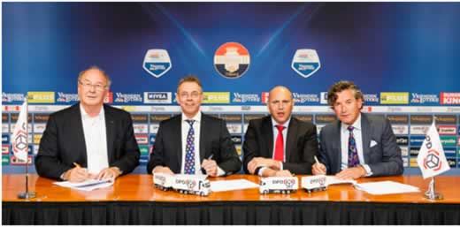 V.l.n.r: Jan van Esch, lid van de Raad van Commissarissen Willem II, Michael van Ooijen C.E.O. DPD Pakketservice, Marco Faber, Algemeen Directeur Willem II en Robert van Straaten, Director Marketing & Sales DPD Pakketservice. Foto: Toin Damen