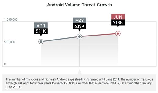 Hackers focussen zich meer en meer op Android-apparaten om malware te verspreiden. Het aantal gebruikers van Android blijft toenemen en er is weinig aandacht voor beveiliging op het platform. Het Security Roundup Report van Trend Micro laat zien dat het aantal kwaadaardige en risicovolle Android apps wereldwijd stijgt met 41 procent, van 509.000 in het eerste kwartaal tot een totaal van 718.000 aan het einde van het tweede kwartaal. Kortom, Android malware ligt perfect op schema om de 1 miljoen te halen zoals
