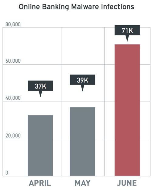Daarnaast waarschuwen de onderzoekers voor toenemende bedreigingen bij online bankieren. De malware nam met 29 procent toe ten opzichte van het vorige kwartaal en groeide van 113.000 infecties tot 146.000 infecties in totaal. Ongeveer 29 procent van deze infecties is het gevolg van ‘oude’ malware in een ‘nieuwe’ verpakking. De Verenigde Staten was met meer dan één miljoen gemelde infecties het belangrijkste doelwit voor internetbankieren (28 procent).