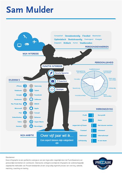George Buysrogge, directeur van Procam: “Ondanks dat er veel vraag is naar jonge IT’ers is het voor veel starters toch nog een lastige klus om juist die ene droombaan te bemachtigen. Hun onervarenheid speelt ze parten bij sollicitaties. Daarnaast is bij die droombanen veel concurrentie, en zie met een cv en sollicitatiebrief maar eens op te vallen. Met de TalentTool bieden wij starters een eenvoudige en handige tool om zelf kosteloos een persoonlijke infographic te maken. De uitkomsten geven daarnaast leuke inhakers om over te praten tijdens het gesprek en kunnen het ijs breken. Door het invullen worden starters op een speelse manier uitgedaagd om alvast na te denken over hun ambities en persoonskenmerken. Dat is iets wat Procam hoog in het vaandel heeft staan. Met ons TalentWings talentenprogramma gaan we hier nog een stap verder in. Om doelgericht aan je carrière te kunnen werken en te excelleren in een functie is het van belang om jouw persoonlijkheid, kwaliteiten en ambities boven tafel te krijgen.”