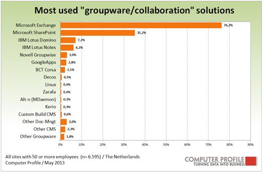 Breda, 13 augustus 2013 - Meer dan driekwart van de Nederlandse bedrijfsvestigingen maakt gebruik van Microsoft Exchange. Daarmee is het met voorsprong de meest gebruikte groupware/collaboration oplossing. Een andere oplossing van Microsoft neemt de tweede plaats in. SharePoint is namelijk in gebruik bij ruim een derde van deze bedrijfsvestigingen. Voor beide oplossingen is het gebruik ten opzichte van een jaar geleden gestegen met circa 2 procentpunt. Alle andere groupware/collaboration oplossingen komen voor bij minder dan 10 procent van de locaties. IBM is de koploper in de achtervolgende groep. Bij ongeveer 7 procent van de locaties wordt gebruik gemaakt van het Lotus platform. Novell Groupwise, ooit trotse marktleider op dit terrein, wordt ingezet bij circa 3 procent. Dit blijkt uit de circa 6.500 interviews die