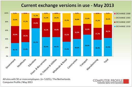 Momenteel zijn er vier verschillende versies van Exchange in gebruik. Exchange 2000 is zo goed als verdwenen bij de doelgroep. Minder dan een procent van de aangetroffen Exchange installaties betreft deze versie. Het afgelopen jaar lijkt wel een omslagpunt te zijn geweest in het gebruik van de verschillende Exchange versies. Exchange 2010 is momenteel de meest gebruikte oplossing. Circa 42 procent van de geïnventariseerde Exchange oplossingen betreft deze variant. In 2011 (Q2) bedroeg dat nog een kleine 7 procent van de Exchange installaties, in 2012 (Q2) was dat circa 27 procent van de installaties. Kortom, in een hoog tempo neemt het aandeel Exchange 2010 toe in de totale installed base. Voor Exchange 2007 is tot 2011 een toenemend aandeel te zien, de jaren daarna daalde het telkens licht tot de huidige 31 procent van alle Exchange installaties.