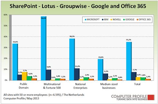 Waar in Exchange de nadruk meer ligt op mail en agendafuncties ligt in SharePoint de nadruk veel eerder op het samenwerken. Blijkbaar is de behoefte aan samenwerken het hoogst bij bedrijfsvestigingen van Multinationals & Fortune 500 bedrijven. Binnen dit segment geeft circa 59 procent van de locaties aan dat men SharePoint gebruikt, wat hetzelfde percentage is als een jaar geleden. In het segment National Enterprises laten de bedrijfsvestigingen een aardige stijging zien. Nu geeft 38 procent van de locaties aan dat er een SharePoint oplossing in gebruik is, een jaar geleden bedroeg dat circa 31 procent.