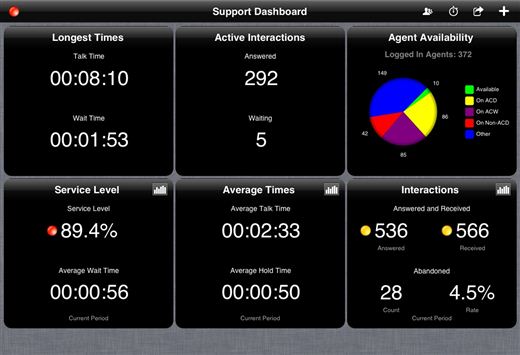 - Dashboard (configureerbaar) met wireless toegang tot real time scores en statistieken van spraakanalyse en service levels per werkgroep, wachtrij, agent en interval