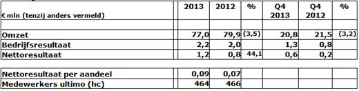 De totale netto-omzet in 2013 bedraagt EUR 77,0 miljoen, een daling van 3,5% ten opzichte van de omzet in 2012 (EUR 79,9 miljoen).
