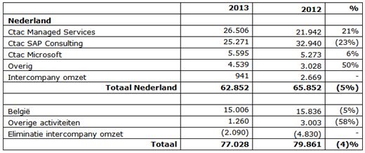De omzet consultancy, hosting en beheer daalt van EUR 66,7 miljoen in 2012 naar EUR 64,6 miljoen in 2013, hetgeen een daling van 3,2% impliceert. Omdat de externe inhuur met 11,7% is afgenomen tot EUR 11,9 miljoen in 2013 (EUR 13,4 miljoen in 2012) is de bruto marge slechts met 1,0% gedaald naar EUR 51,8 miljoen (2012: EUR 52,3 miljoen).