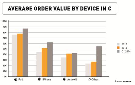 De iPad gaat aan kop met een gemiddelde waarde van € 78 per bestelling, terwijl iPhone-gebruikers items in hun mobiele winkelwagen leggen met een gemiddelde waarde van € 52. Android-gebruikers geven gemiddeld € 42 per aankoop uit. Interessant om te zien is dat de gemiddelde uitgaven op alle mobiele apparaten blijven stijgen. In het eerste kwartaal van 2014 is het gemiddelde winkelmandje op een iPad maar liefst € 88 waard.
