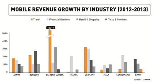 Binnen Europa zijn opvallende verschillen per branche te zien. De Europese gemiddelde groeipercentages qua omzet variëren voor de verschillende branches van 185% (Travel), 162% (Financiële dienstverlening), 114% (Telecom & Services) tot 81% (Retail & Shopping). In de Benelux groeide het segment Telecom het hardst met 290% en Travel volgde met 210% groei. De opkomende markten in Oost-Europa laten echter de meest indrukwekkende m-commerce groei zien. De reisbranche in Oost-Europa groeide maar liefst 1001%. Met een groeipercentage van 331 procent leidt Oost-Europa tevens de ranking in het Retail & Shopping-segment.