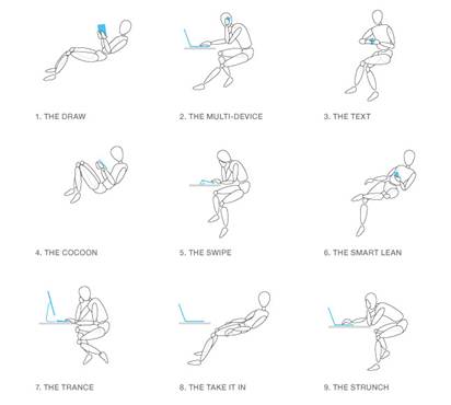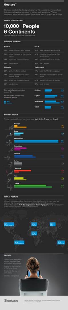 Amsterdam, 11 augustus 2014 – Uit een wereldwijde studie van werkomgevingspecialist Steelcase is gebleken dat onder invloed van het toenemend gebruik van mobiele devices op de werkvloer 9 nieuwe, veel voorkomende zithoudingen zijn te onderscheiden. Een vervolgonderzoek, bestaande uit een online enquête die sinds juni 2014 door meer dan tienduizend kenniswerkers uit zes verschillende continenten is ingevuld, verschaft nu nog meer inzicht in onze zithouding. De enquête over het gebruik van mobiele devices op de werkvloer en typische zithoudingen die hieruit voortvloeien, brengt verschillen tussen mannen en vrouwen en verschillende leeftijdscategorieën aan het licht.