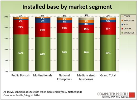 Binnen alle vier de onderscheiden marktsegmenten vormen de Microsoft-oplossingen de grootste groep. Ongeveer de helft van de installed base van Microsoft is SQL Server 2008, iets minder dan een derde is SQL Server 2005 en ongeveer 10 procent SQL Server 2012. DBMS-oplossingen van Oracle zijn binnen de vier marktsegmenten telkens de nummer twee meest voorkomende systemen. Voor de oplossingen van Oracle geldt dat circa een kwart een MySQL-installatie is.