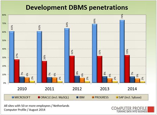 Uit de penetratieontwikkeling van de afgelopen jaren wordt de sterke positie van Microsoft nog duidelijker. In 2010 gaf 61 procent van de bedrijfsvestigingen aan 1 of meerdere SQL Server-systemen te gebruiken. Medio 2014 is dit percentage 74 procent. In 2006 gaf 20 procent aan een Oracle DBMS te gebruiken. Dit aandeel is in de daarop volgende jaren stabiel gebleven, maar met de overname van MySQL heeft Oracle een groter aandeel weten te vergaren. De stijging naar de huidige 33 procent is dan ook voor een belangrijk deel te wijten aan MySQL. Voor zowel IBM, Progress als SAP/Sybase zijn er vooralsnog nauwelijks veranderingen waar te nemen in het percentage vestigingen dat gebruikmaakt van hun databasesystemen.