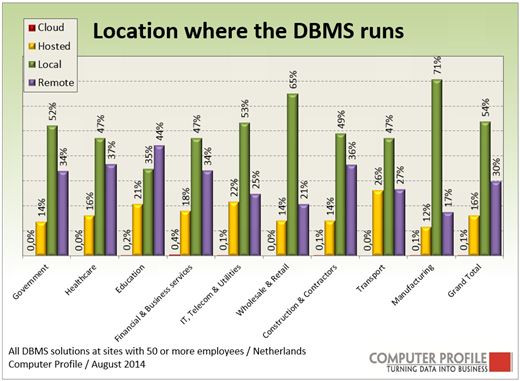 Steeds vaker zien we dat bedrijven er voor kiezen om software niet langer op de eigen locatie te laten draaien, maar om dit onder te brengen op een externe locatie. Voor de gebruikte DBMS-oplossingen heeft Computer Profile onderzocht of deze toepassing op de eigen locatie draait, op een andere locatie maar wel binnen de eigen organisatie (hoofdkantoor/centraal datacenter) of dat hiervoor gebruik wordt gemaakt van een datacenter van een externe dienstverlener. Hieruit blijkt dat 54 procent van de DBMS-oplossingen nog altijd op de eigen locatie draait. Ten opzichte van 2013 is dit een daling van 6 procent. Voor circa 30 procent van de DBMS-systemen geldt dat ze binnen de eigen organisatie draaien, maar wel op een andere locatie en 16 procent van de toepassingen draait binnen de omgeving van een externe dienstverlener, een stijging van 4 procent ten opzichte van vorig jaar.