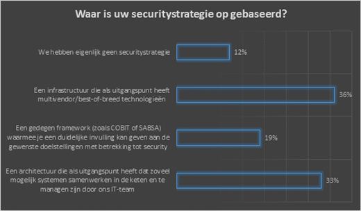 Cisco onder 115 Nederlandse IT-beslissers. 36 procent van de IT-beslissers geeft aan dat de securitystrategie gebaseerd is op een infrastructuur die als uitgangspunt multivendor en/of best-of-breed technologieën heeft en 19 procent op een gedegen framework, zoals COBIT of SABSA, waarmee een duidelijke invulling gegeven kan worden aan de gewenste doelstellingen met betrekking tot security. 12 procent van de IT-beslissers heeft geen IT-securitystrategie.