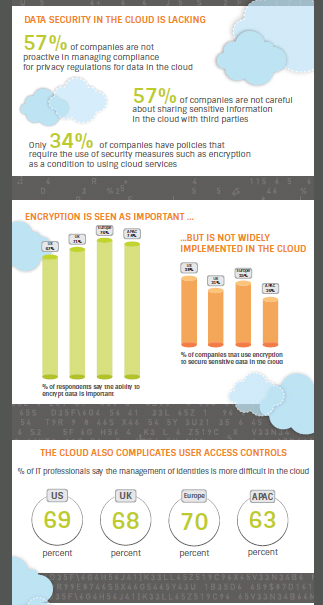 Meer dan twee derde van de respondenten (71 procent) zegt dat het lastiger is gevoelige data in de cloud met traditionele beveiligingsmethoden te beschermen. Bijna de helft (48 procent) vindt het moeilijker om toegang van eindgebruikers tot cloud-data te beheren of te beperken. Daardoor zegt meer dan een derde (34 procent) van de ondervraagde IT-professionals dat hun organisatie een policy heeft, waarin is vastgelegd dat beveiligingsmethoden, zoals encryptie, vereist zijn bij het gebruik van bepaalde cloud computing-oplossingen. 71 procent van de respondenten geeft aan dat het belangrijk is om gevoelige of vertrouwelijke informatie te versleutelen of van tokens te voorzien. 79 procent zegt dat dit in de komende twee jaar nog belangrijker wordt.
