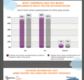 Als het gaat om toegang tot data in de cloud, vindt 68 procent van de respondenten het gebruikersbeheer moeilijker in de cloud. Bij 62 procent hebben derde partijen toegang tot de cloud. Bijna de helft (46 procent) maakt binnen het bedrijf gebruik van two-factor authenticatie om toegang van derde partijen tot data in de cloud te beveiligen. Nog eens 48 procent zet deze vorm van authenticatie in voor de toegang van werknemers tot de cloud.