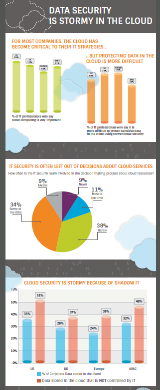 Hoewel organisaties steeds meer aan cloud computing doen, ondervindt het IT-personeel moeite om data in de cloud te beheren en te beveiligen. Het onderzoek toont aan dat slechts 38 procent van de organisaties duidelijke rollen heeft vastgesteld en één aanspreekpunt heeft aangesteld voor het beveiligen van vertrouwelijke en gevoelige informatie in de cloud. Bovendien blijkt dat 44 procent van de zakelijke data opgeslagen in een cloud-omgeving, niet onder beheer van de IT-afdeling valt. En meer dan twee derde (71 procent) van de respondenten geeft aan dat het moeilijker is om gevoelige data in de cloud met traditionele beveiligingsmethoden te beschermen.