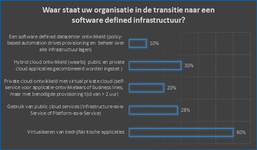 EMC onder 115 Nederlandse IT-beslissers. In dit onderzoek is antwoord gegeven op de vraag waar organisaties staan in de transitie naar een software defined infrastructuur. 30 procent van de IT-beslissers zegt een hybrid cloud ontwikkeld te hebben, 28 procent gebruikt public cloud services, 20 procent heeft een private cloud ontwikkeld en 10 procent geeft aan een software defined datacenter ontwikkeld te hebben.