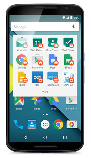 - Android for Work app – Voor apparaten (Ice Cream Sandwich/ Kitkat) die niet standaard voorzien zijn van werkprofielen, heeft Google de Android for Work app ontwikkeld. Daarmee heeft de gebruiker beveiligde toegang tot e-mail, agenda, contacten, documenten en tot goedgekeurde zakelijke apps. Tevens kan de app volledig worden beheerd door de IT-afdeling.