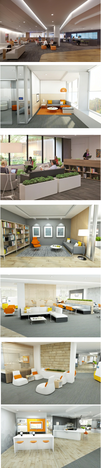 WorkCafé-concept, een informele werkomgeving binnen het bestaande kantoor. Een WorkCafé-omgeving combineert een huiselijke uitstraling en de atmosfeer van een koffiesalon met de technologische ondersteuning en het ergonomisch comfort die nodig zijn om goed te kunnen werken. Het biedt een grote verscheidenheid aan werkplekken, zodat medewerkers altijd een werkplek kunnen kiezen die aansluit bij hun gemoedstoestand en de taken die ze moeten uitvoeren. ‘In een wereld die alsmaar mobieler wordt en waar afstand dankzij de technologische mogelijkheden feitelijk geen rol meer speelt, is het de uitdaging om mensen écht samen te brengen op een plek waar ze hun ideeën direct kunnen omzetten in concrete acties’, aldus Small. ‘Door binnen het kantoor een omgeving te creëren met een informeel karakter kom je tot effectieve creativiteit.’